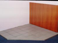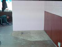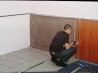 1. Подготавливаем место под установку печи. Под размеченный уголок срезаем кусок линолеума и подготавливаем пол под укладку плитки.