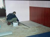 3. После укладки плитки затираем швы, укладываем ковролин и края заделываем с помощью металлических полосок.